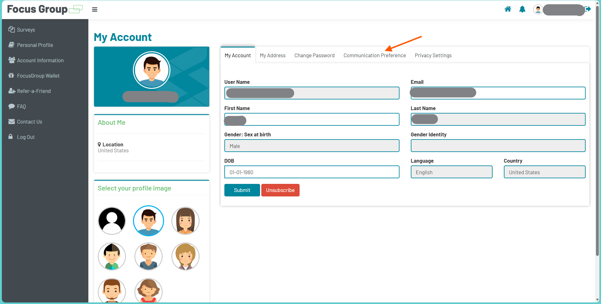 1. In your Focus Group profile, go to the Account Information page and click the Communication Preference tab.