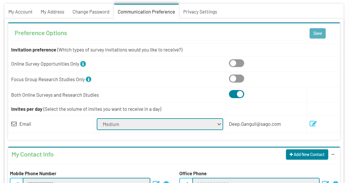 2. Select your invitation preference. You can select Online Survey Opportunities only, Focus Group Research Studies only, or both Online Survey Opportunities and Focus Group Research Studies. Use the On/Off switch to choose your preference.