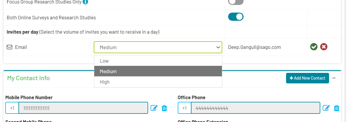 In your Focus Group profile settings, you can set how often you’d like to receive study invitation emails and what types of studies interest you. You can customize your preferences, whether you’re interested in Online Surveys, Focus Group Research Studies, or both. You can also choose the frequency of emails per day as low, medium, or high.